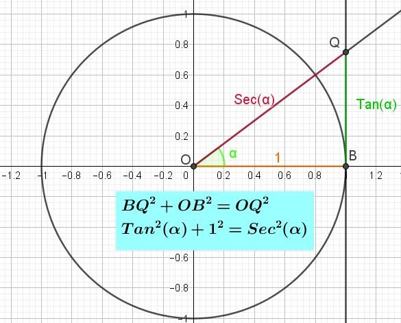 Puede demostrarse la identidad pitagórica de la tangente si se considera el triángulo OBQ rectángulo en B (figura 2). Aplicando el teorema de Pitágoras a dicho triángulo se tiene que BQ2 + OB2 = OQ2. Pero ya se ha dicho que BQ = Tan(α), que OB = 1 y que OQ = Sec(α), de modo que sustituyendo en la igualdad de Pitágoras para el triángulo rectángulo OBQ se tiene: