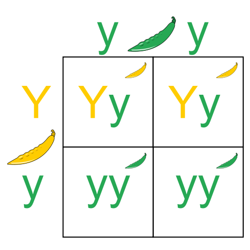 - Primera ley de Mendel. Llamada “Ley de los caracteres dominantes o de la uniformidad de los híbridos”, con ella, Mendel descubrió que si se cruzaba una línea de guisantes de semillas lisas con otra línea de guisantes de semillas rugosas, los individuos que nacían de esa primera generación eran uniformes y se parecían a la semilla lisa. Al obtener dicho resultado, entendió que cuando se cruza una especie pura con otra, la descendencia de esa primera generación filial será igual en su genotipo y fenotípicamente más parecida al portador del alelo o gen dominante, en este caso, la semilla lisa. Un ejemplo más común: si la madre posee ojos negros y el padre ojos azules, el 100% de sus hijos saldrá de ojos negros, como la madre, por ser quien porta el carácter dominante. Esta ley enuncia que “cuando se cruzan dos individuos de raza pura, los híbridos resultantes son todos iguales”.