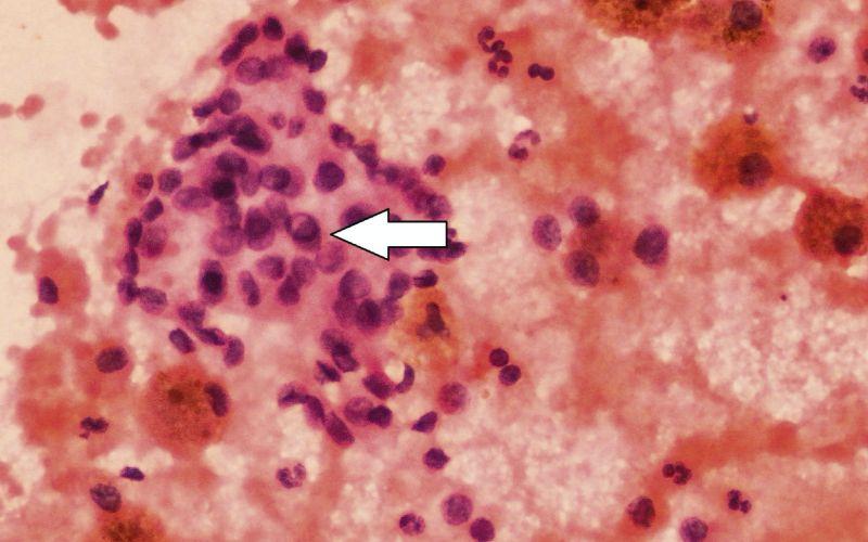Citopatología tiroidea sospechosa de carcinoma papilar. Inclusión citoplasmática intranuclear (indicadas con la flecha) en células foliculares ocasionales. Fuente: Bakiarathana Anand, Anita Ramdas, Marie Moses Ambroise, and Nirmal P. Kumar, CC BY 4.0, Wikimedia Commons