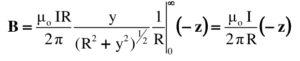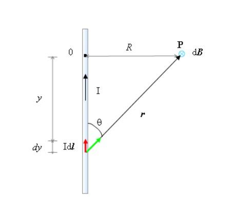 - El alambre se encuentra dirigido en dirección vertical, con la corriente I fluyendo hacia arriba. Esta dirección es +y en el sistema de coordenadas, cuyo origen está en el punto O.