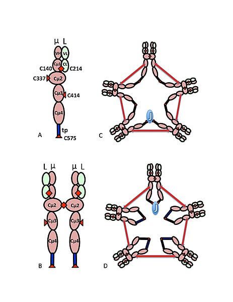En la forma pentamérica, cada monómero de la IgM interactúa con una cadena polipeptídica de unión llamada cadena J, de 15 kDa y que permite la formación de la estructura formada por los 5 monómeros.