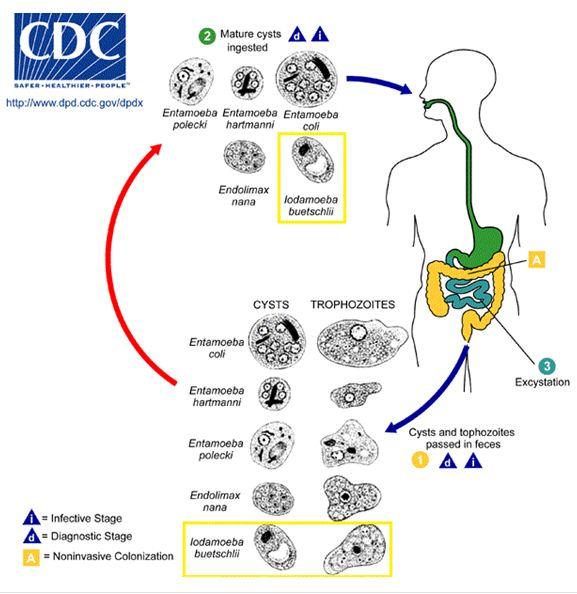 Los quistes son la forma infectiva del protozoario, los cuales son ingeridos por el individuo. A través del tránsito intestinal, recorren el tracto digestivo hasta que llegan al lugar ideal para su desarrollo: el colon, específicamente en el ciego.