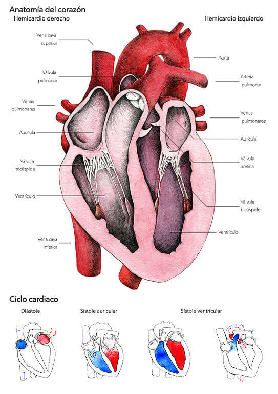 - Acciones del simpático sobre el corazón. El sistema nervioso simpático ejerce una acción positiva sobre todas las funciones cardíacas, incrementando la frecuencia cardíaca (cronotropismo +), la fuerza de contracción (inotropismo +), la conducción de la excitación (dromotropismo +) y la velocidad de relajación (lusotropismo +). Todas esas acciones se ejercen mediante la liberación de noradrenalina (NA) en las terminaciones posganglionares simpáticas sobre las células de los nodos cardíacos, del sistema de conducción o sobre los miocitos contráctiles auriculares y ventriculares. Las acciones de la noradrenalina se desencadenan cuando este neurotransmisor se une a unos receptores adrenérgicos tipo β1 ubicados en las membranas de las células cardíacas y acoplados a una proteína Gs. Esta es una proteína con tres subunidades (αsβγ) que cuando está inactiva tiene GDP unido a su subunidad αs. La interacción noradrenalina-receptor β1 hace que la subunidad αs libere su GDP y lo cambie por GTP; al hacerlo, se separa del componente βγ y activa a la enzima membranal adenilciclasa, la cual produce adenosín monofosfato cíclico (AMPc) como segundo mensajero que activa a la proteín quinasa A (PKA). La actividad fosforilante de la PKA es en último término la responsable de todas las acciones estimuladoras que las fibras simpáticas ejercen sobre el corazón, e incluye la fosforilación de canales de Ca++, de la troponina I y del fosfolamban. La acción sobre los canales de Ca++ favorece los incrementos de frecuencia cardíaca, de fuerza contráctil y de velocidad de conducción. Los efectos sobre la troponina I y sobre el fosfolamban aceleran el proceso de relajación del músculo cardíaco. La fosforilación de la troponina I hace que esta proteína acelere el proceso de liberación del Ca++ de la troponina C para que la relajación ocurra más rápido. El fosfolamban inhibe naturalmente a la bomba que reintroduce el Ca++ al retículo sarcoplásmico para terminar la contracción, inhibición que se reduce cuando aquel se fosforila.