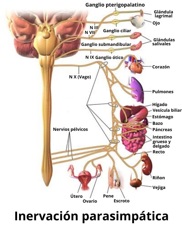 - Inervación parasimpática. La inervación parasimpática del corazón cursa con el nervio vago y sus componentes tienen una organización de cadenas bineuronales similares a las del simpático, con neuronas preganglionares cuyos cuerpos se encuentran en el núcleo motor dorsal del vago en el bulbo, en el piso del cuarto ventrículo. Debido a los efectos reductores de la actividad cardíaca que dichas neuronas ejercen sobre el corazón, han recibido en conjunto el nombre de centro cardioinhibidor bulbar. Sus fibras se separan del tronco vagal en el cuello y se entremezclan luego con las fibras simpáticas cardíacas formando un plexo. Los ganglios parasimpáticos se encuentran en las cercanías del corazón y las fibras posganglionares del lado derecho terminan fundamentalmente en el nodo sinoauricular, marcapaso natural del corazón, y las izquierdas en el nodo auriculoventricular y en los miocitos contráctiles auriculares.