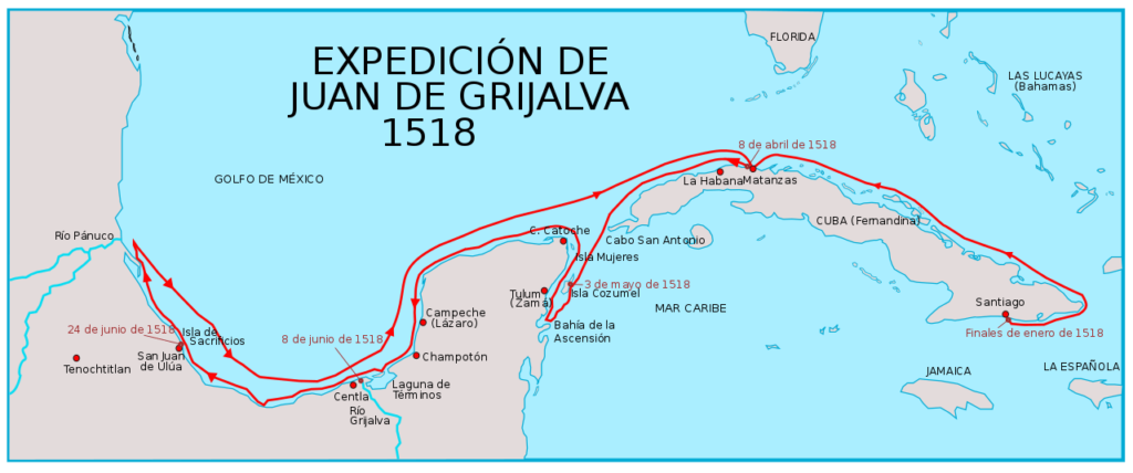 Más adelante, Juan de Grijalva comandó una expedición a las costas del actual México. Durante su recorrido exploró Yucatán y Tabasco hasta llegar a Veracruz. Además de descubrir varios ríos, Grijalva fue el primero conocer la existencia de un gran imperio que dominaba el interior del territorio: el azteca.