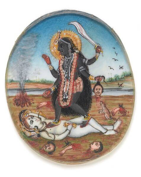 Hay varias representaciones de Kali, pero la más usual suele ser la de una mujer con varios brazos, de color negro, que está pisando el cuerpo sin vida de Shiva.