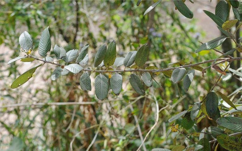 – Hojas. Esta planta posee hojas simples, con un pecíolo de 2 a 10 mm, siendo de tipo oblonga a elíptico-oblonga, o elíptica-ovada. Cuenta con una base redondeada o truncada a aguda y sus márgenes son enteros o débilmente crenados. Su ápice tiene forma redondeada o de truncada a aguda. Posee una superficie glabra, poco puberulenta (con pocos pelillos) a lo largo de las venas.