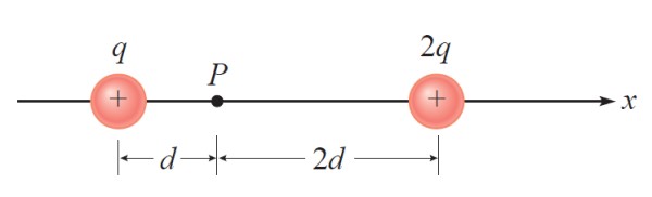 En la siguiente figura hay dos cargas puntuales +q y +2q. Una tercera carga puntual –q se coloca en P. Se pide encontrar la fuerza eléctrica sobre esta carga debido a la presencia de las otras.