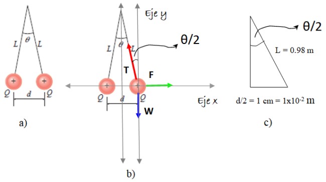 Dos esferitas de poliestireno de igual masa m = 9.0 x 10-8 kg tienen igual carga positiva Q y están suspendidas mediante un hilo de seda de longitud L = 0,98 m. Las esferas están separadas una distancia de d = 2 cm. Calcular el valor de Q.