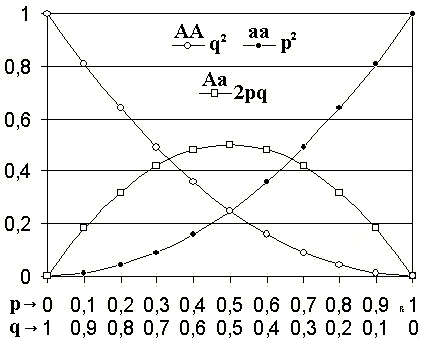 Según este modelo, cuando las frecuencias alélicas de una población son p y q, las frecuencias genotípicas serán p2, 2pq y q2.