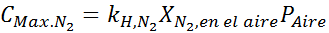 En base al enunciado, podemos deducir que la concentración máxima de nitrógeno es la que se da cuando la presión del aire es de 4,00 atm. Según la Ley de Henry y utilizando la relación entre presión total y presión parcial del ejemplo anterior: