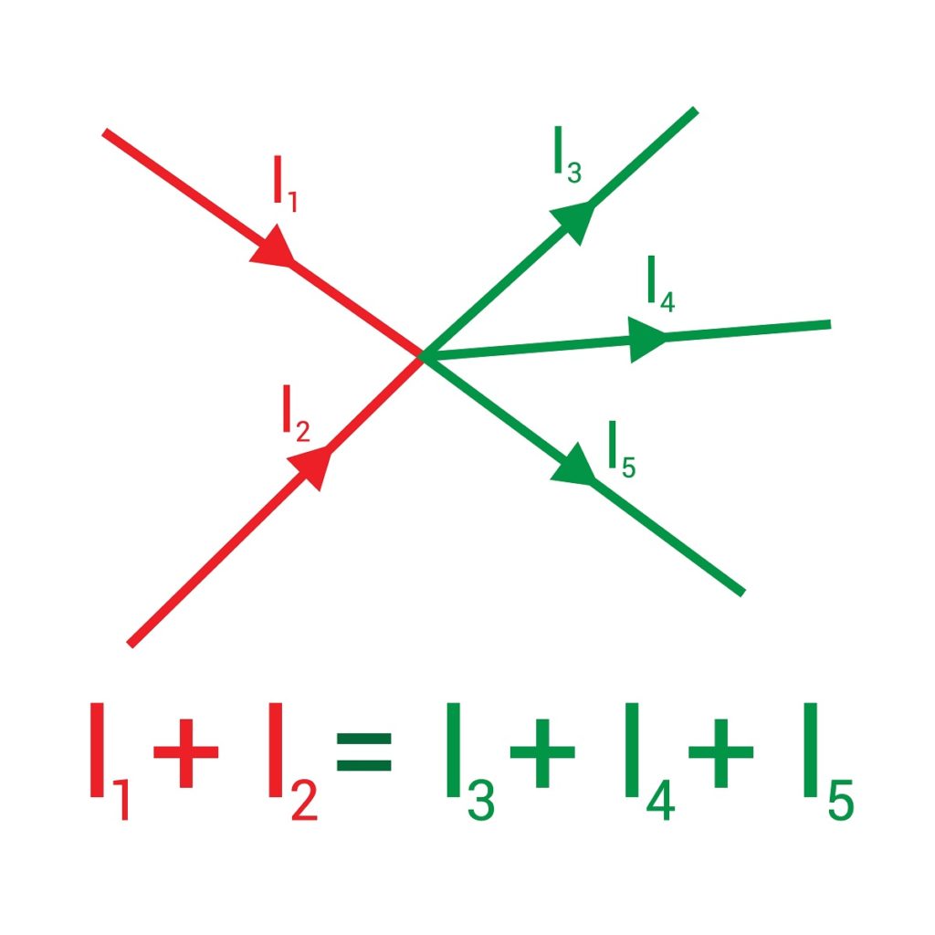 En la siguiente imagen se muestran dos corrientes que entran a un nodo, dibujadas en rojo: I1 e I2, y que al salir se muestran en color verde: las corrientes I3, I4 e I5.