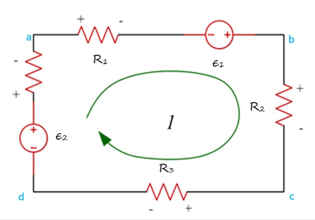 En la siguiente figura se tiene la malla abcda, por la cual circula una corriente I en el sentido de las agujas del reloj y el recorrido se puede empezar en cualquier punto del circuito.