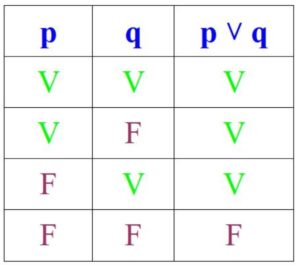 Por otra parte, en la disyunción, la proposición es verdadera si p y q son verdaderas o si al menos una de ellas lo es, pero es falsa si ambas lo son: