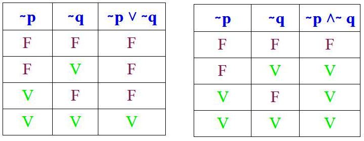 Y hay que comprobar que se obtienen estos resultados al llevar a cabo las tablas de verdad respectivas de (∼ p ˅ ∼ q) y (∼ p ˄ ∼ q):