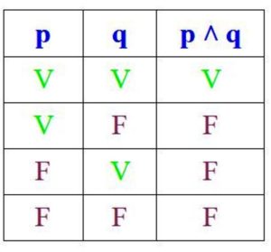 Puesto que la conjunción solo es verdadera cuando p y q son verdaderas, su tabla de verdad es: