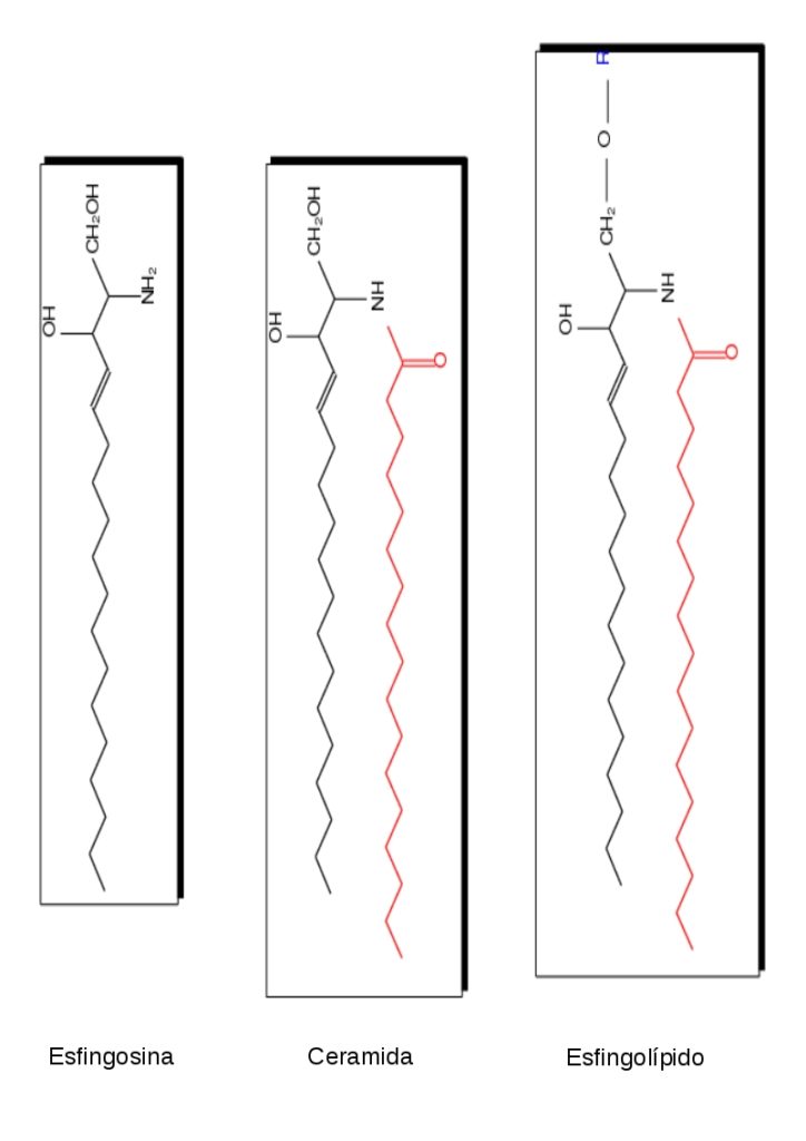 Los esfingolípidos están formados por una molécula de esfingosina (un aminoalcohol de 18 átomos de carbono) que está unida a un ácido graso mediante un enlace amida.