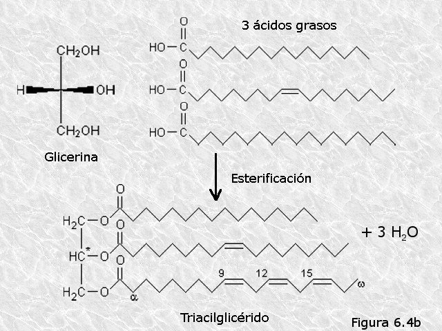Los triglicéridos, de forma similar a los fosfolípidos, son moléculas lipídicas ensambladas sobre un esqueleto de glicerol, pero se diferencian de los anteriores en que en vez de un grupo fosfato están esterificados a un tercer ácido graso.