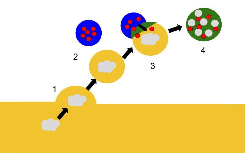 Dichas moléculas son ingeridas por una vacuola fagocítica, denominada fagosoma, que, al igual que en el caso anterior, se fusionará con los lisosomas. La fusión da lugar a la liberación de enzimas digestivas en el interior del fagosoma y se procede a la degradación de las partículas.