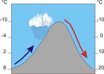 La lluvia orográfica se produce cuando el aire húmedo es empujado desde el mar hacia una montaña por una pendiente en forma ascendente. Se trata del núcleo de la interacción entre la superficie terrestre y la atmósfera.