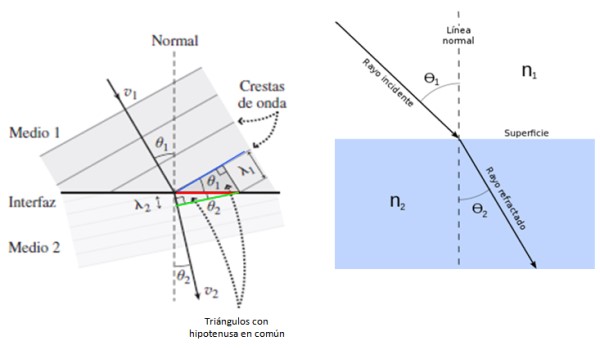 Obsérvese los triángulos que tienen hipotenusa en común en color rojo. En cada medio, la hipotenusa mide λ1/sen θ1 y λ2/sen θ2 respectivamente, en vista de que λ y v son proporcionales, por lo tanto: