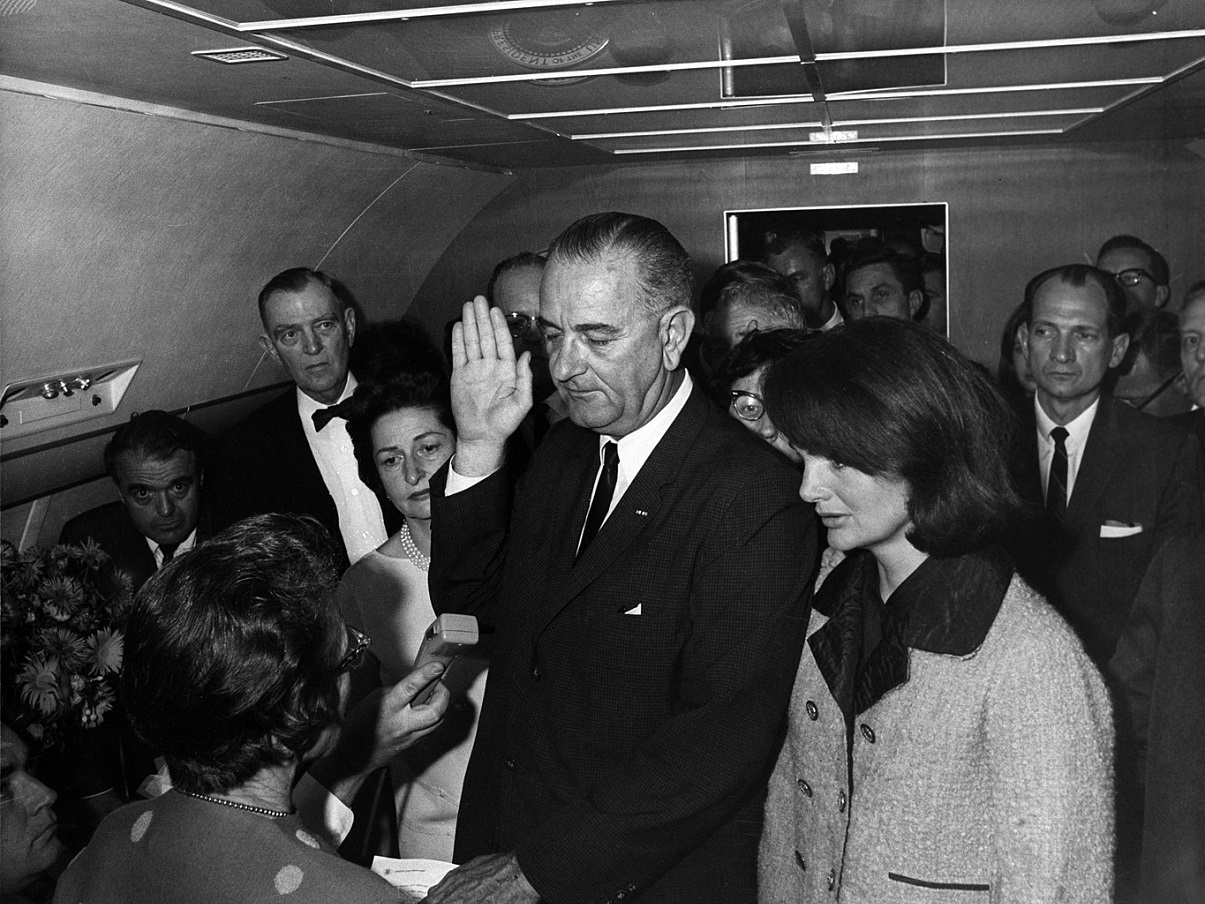 John F. Kennedy sufrió un atentado en el que perdió la vida el 22 de noviembre de 1963. Dos horas más tarde Lyndon Johnson fue juramentado como presidente de los Estados Unidos a bordo del Air Force One en Dallas, Texas como una respuesta rápida para dar estabilidad y calma al país.