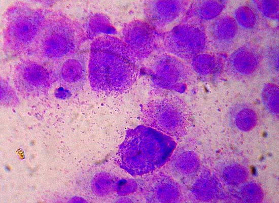 Citología de un tumor. Las células que se observan son mastocitos. Fuente: Joel Mills CC BY-SA 3.0, Wikimedia Commons