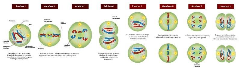 Como se verá a continuación, cada una de las dos meiosis está compuesta por una profase, una metafase, una anafase y una telofase.