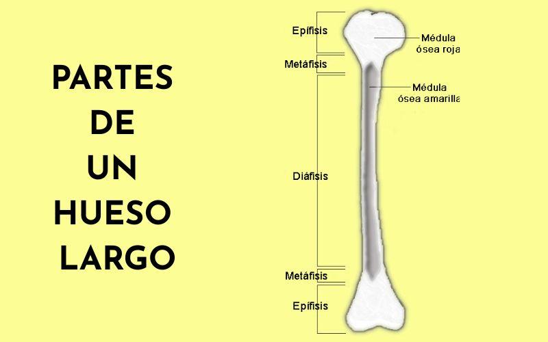 Los huesos largos constan de tres partes, las epífisis, que se ubican en los extremos, la diáfisis, que forma la parte media del hueso, y la metáfisis, que se ubica entre estas dos porciones.