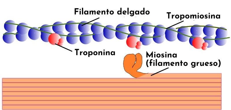 En reposo, la tropomiosina cubre o “tapa” los sitios de unión de la actina para la miosina, impidiendo la interacción de ambas proteínas, que es la que origina la contracción muscular. Alrededor de cada filamento delgado y a unos 25 o 30 ηm del inicio de cada tropomiosina se encuentra otra proteína llamada troponina.