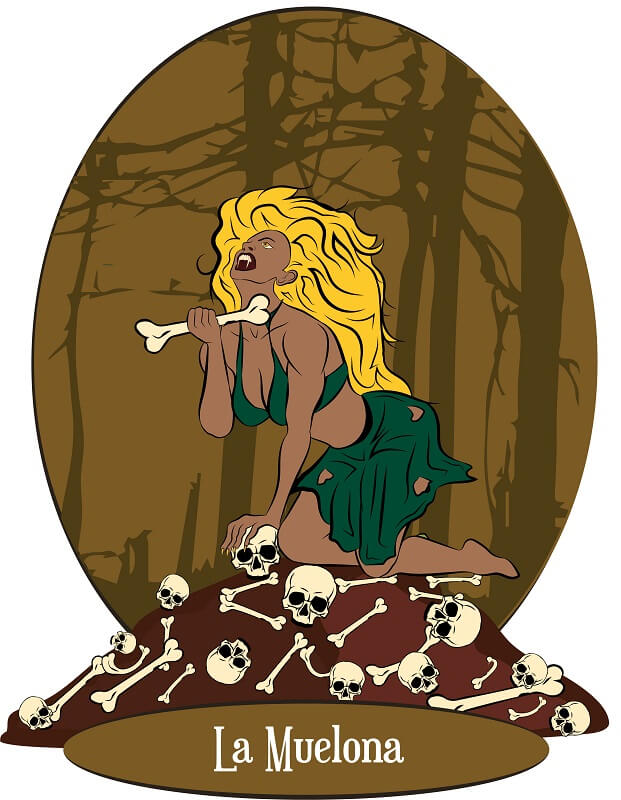 Su nombre “muelona” hace referencia a los enormes dientes que posee. Al igual que otros mitos como La Llorona o El Silbón, anuncia su presencia haciendo ruido, en este caso haciendo rechinar sus dientes.