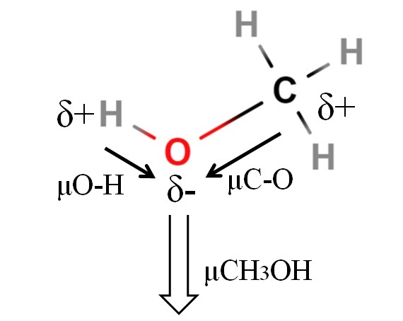 Por eso habría que medir la longitud del enlace H-O en el metanol para poder calcular μO-H. Lo que sí puede afirmarse es que μO-H es más grande que μC-O, pues la diferencia de electronegatividad entre el carbono y oxígeno es menor que entre el hidrógeno y oxígeno.