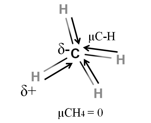 No obstante, al dividirse el CH4 por la mitad obtendríamos dos mitades H-C-H, una a la izquierda y la otra a la derecha, similares a la molécula H2O. Así pues, el momento dipolar resultante de sumar estos dos μC-H se cancelería con el de la otra mitad. Y por lo tanto, μCH4 tiene un valor de 0D.