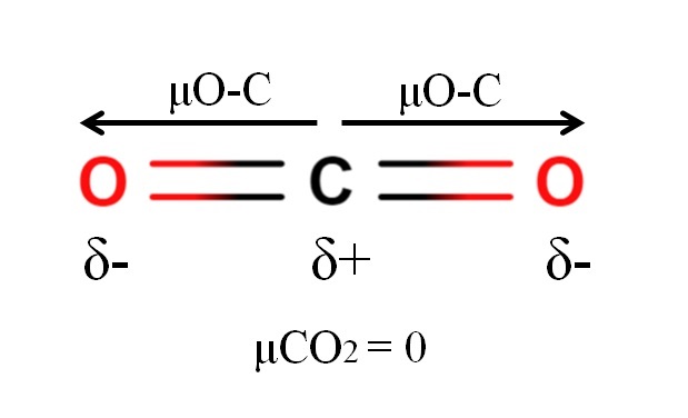 El dióxido de carbono tiene dos enlaces polares, C=O, con sus respectivos momentos dipolares μO-C. No obstante, como se aprecia en la imagen superior, la geometría lineal del CO2 hace que vectorialmente los dos μO-C se cancelen entre sí, aun cuando el carbono tenga carga parcial positiva y los oxígenos cargas parciales negativas.