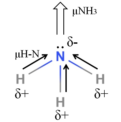 Los enlaces H-N son bastante polares, por lo que el nitrógeno, a raíz de su mayor electronegatividad, atrae los electrones hacia sí (imagen superior). Además, sobre él tenemos un par de electrones no compartidos, que aportan sus cargas negativas a la región δ-. Por lo tanto, las cargas eléctricas predominan en el átomo de nitrógeno del amoníaco.