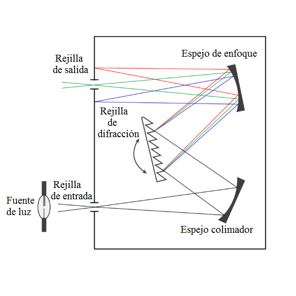 La luz proveniente del espejo colimador incide sobre las ranuras de las rejillas y es descompuesta en radiaciones de diferentes longitudes de onda, las cuales emergen de las rejillas con diferentes ángulos.