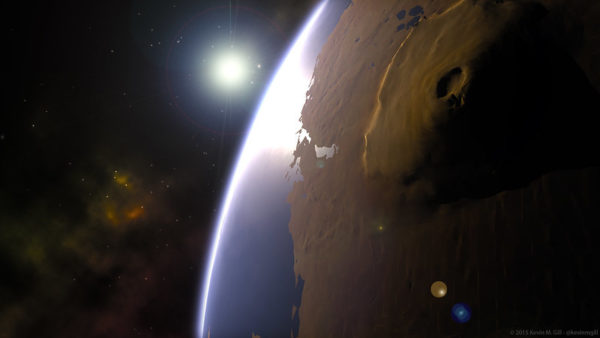 Representación artística de la puesta de Sol sobre el Monte Olimpo en Marte. Fuente: Kevin Gill a través de Flickr.