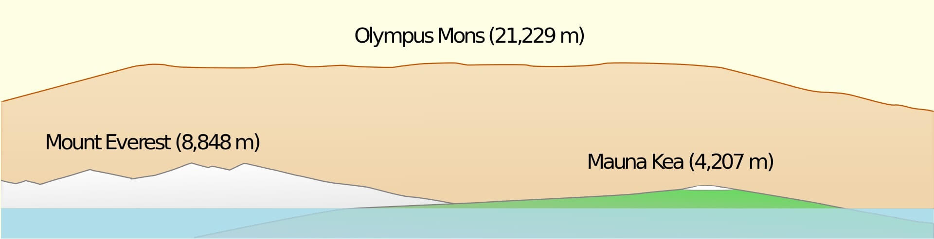 Comparación del Monte Olimpo con el Monte Everest y Mauna Kea. Fuente: Resident Mario / CC BY-SA 3.0, via Wikimedia Commons