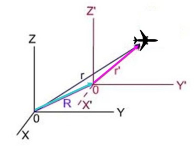 En el siguiente esquema, r es la posición del avión vista desde el sistema xyz, r’ es la posición desde el sistema x’y’z’ y R es la posición del sistema con prima respecto al sistema sin prima. Los tres vectores forman un triángulo en el cual R + r’ = r, por lo tanto, r’ = r – R.