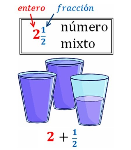 En la imagen hay un ejemplo de número mixto, que demuestra lo frecuentes que son. Tenemos 2 vasos y medio de agua, que como número mixto se expresa así:
