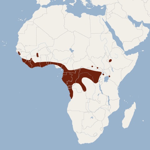 Esta especie ha sido reportada principalmente en las regiones centrales y occidentales de África ecuatorial con unas pocas poblaciones al oriente en Etiopia y Kenia. Su distribución más al sur se corresponde con Angola y la República Democrática del Congo.