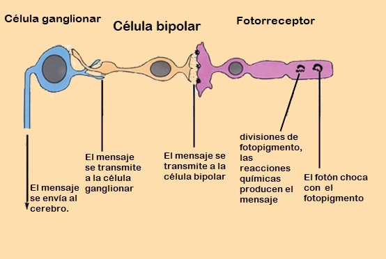 Las prolongaciones de las neuronas bipolares se encuentran conectadas con la capa externa de la retina. Esta capa externa está formada principalmente por las células ganglionares, lugar desde donde parten los nervios ópticos.