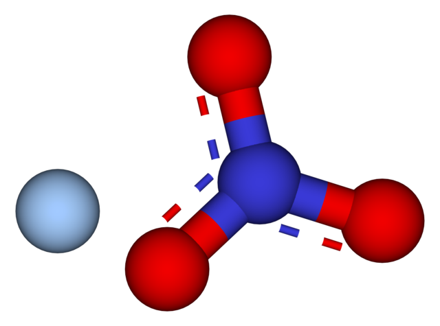 El anión NO3– (de esferas rojas y azulada) tiene geometría plano trigonal, con la carga negativa deslocalizándose entre sus tres átomos de oxígeno. Por lo tanto, las interacciones electrostáticas entre ambos iones tienen lugar específicamente entre el catión Ag+ y un átomo de oxígeno del anión NO3– (Ag+—ONO2–).