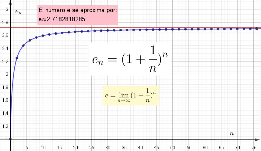 Lo importante es entender que entre mayor sea el valor de n elegido para calcular en, más cerca se estará del valor verdadero. Pero ese valor verdadero solo se tendrá cuando n sea infinito.
