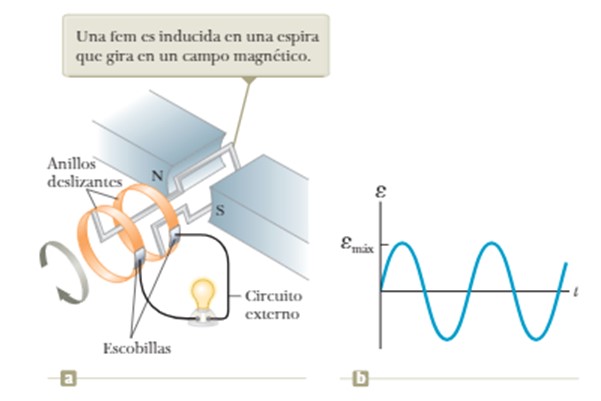 Figura 4. Generador de onda basado en la Ley de inducción de Faraday. Fuente: Raymond A. Serway, Jonh W. Jewett CC BY-SA 4.0, Wikimedia Commons