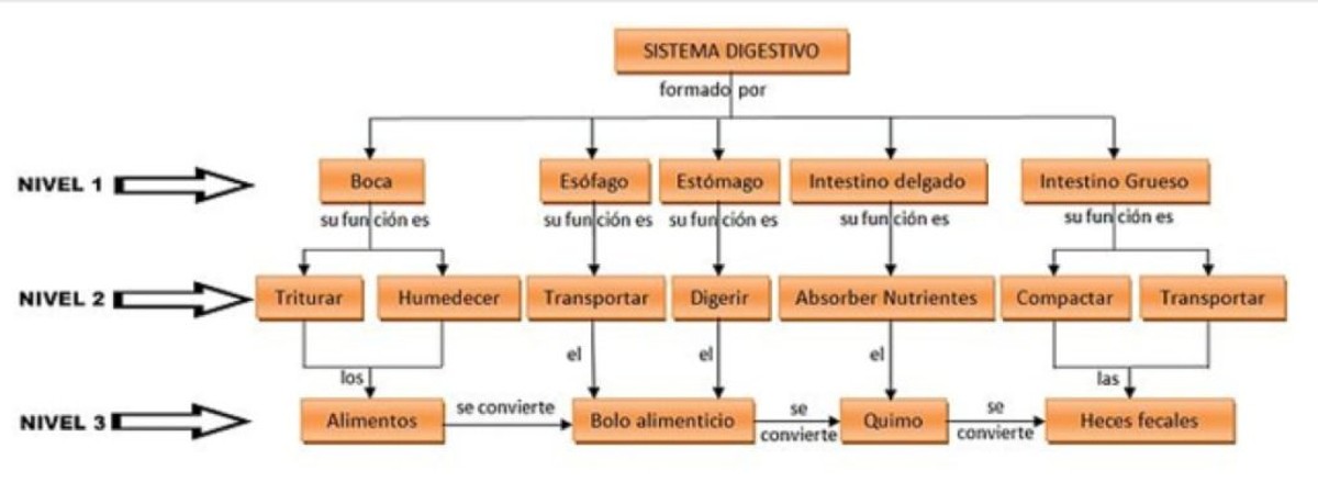 El mapa conceptual se dibuja respetando la jerarquía de los conceptos, tal como se muestra en el siguiente mapa de ejemplo, cuyo tema principal es el sistema digestivo. Este esquema en particular contiene tres niveles de jerarquización y resume las partes del sistema con sus respectivas funciones.