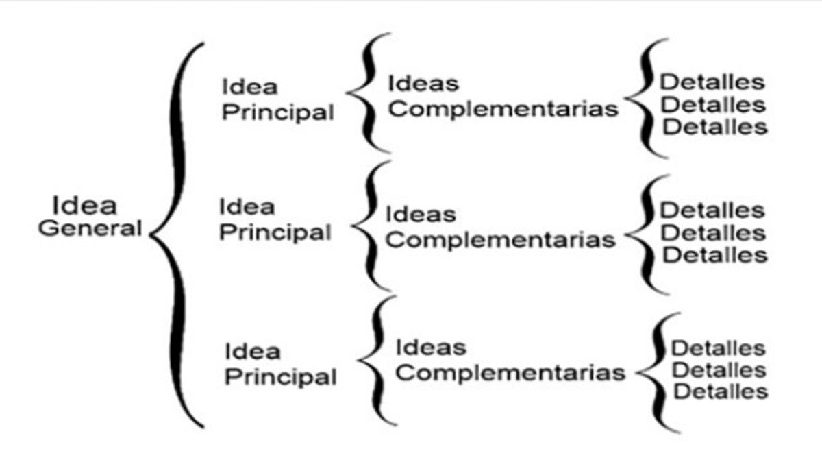 Es un esquema clásico de estudio, también conocido como cuadro sinóptico. Las ideas se distribuyen de forma jerárquica, utilizando para ello llaves o corchetes para separar cada ítem o apartado.
