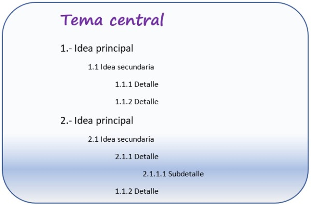 Este esquema jerárquico, usualmente numerado, puede emplearse tanto si se escribe a mano como si se emplea un procesador de texto, el cual dispone de las herramientas para añadir la numeración y la sangría.