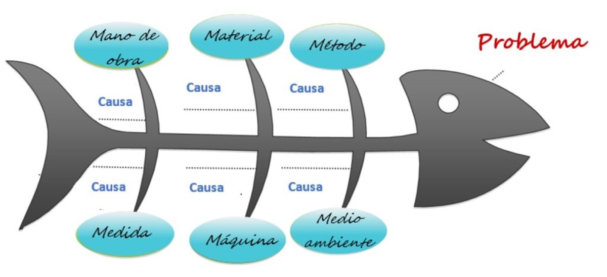 Con frecuencia el diagrama se dibuja como la espina de un pescado, con el problema a la cabeza. A un lado, en cada espina, se van colocando las respectivas causas y los efectos.