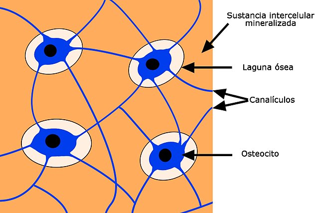 Por otro lado, superficialmente se encuentran separadas en algunos puntos por espacios llamados lagunas osteocitarias, que contienen las células óseas denominadas osteocitos. Estos espacios se comunican con los conductos de Havers a través de estrechos canales, o canalículos.